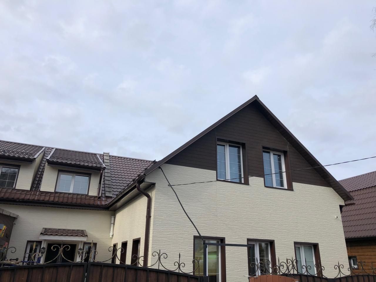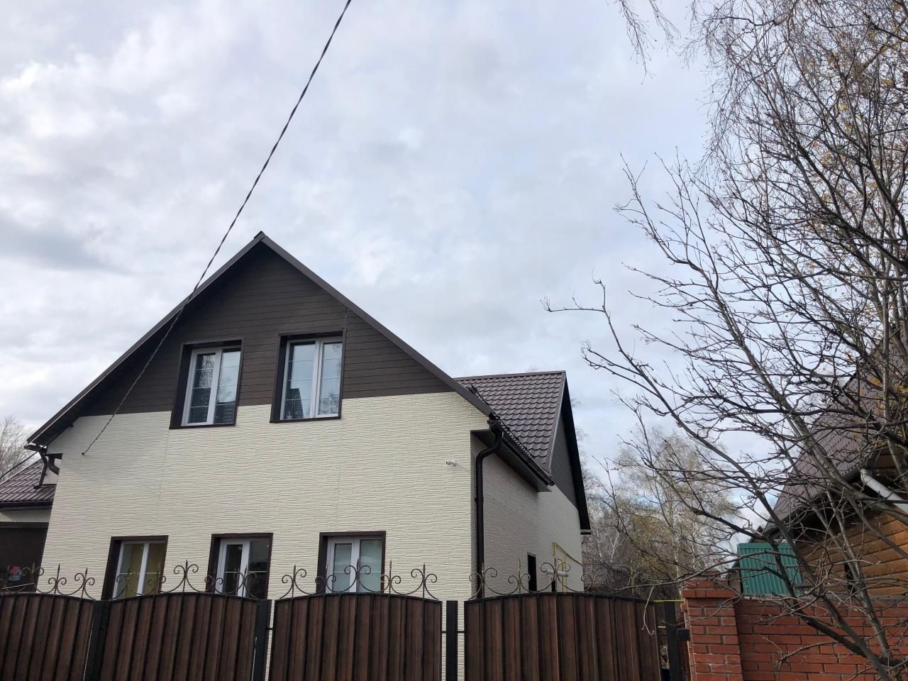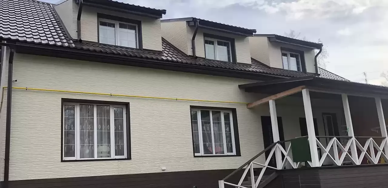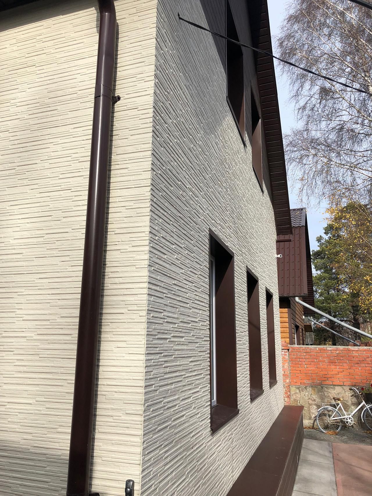 Монтаж фасада из фиброцементных панелей. Монтаж карнизных свесов, водосточной системы.Реконструкция скатной кровли (дополнительное утепление, увеличение вентиляционного зазора).
